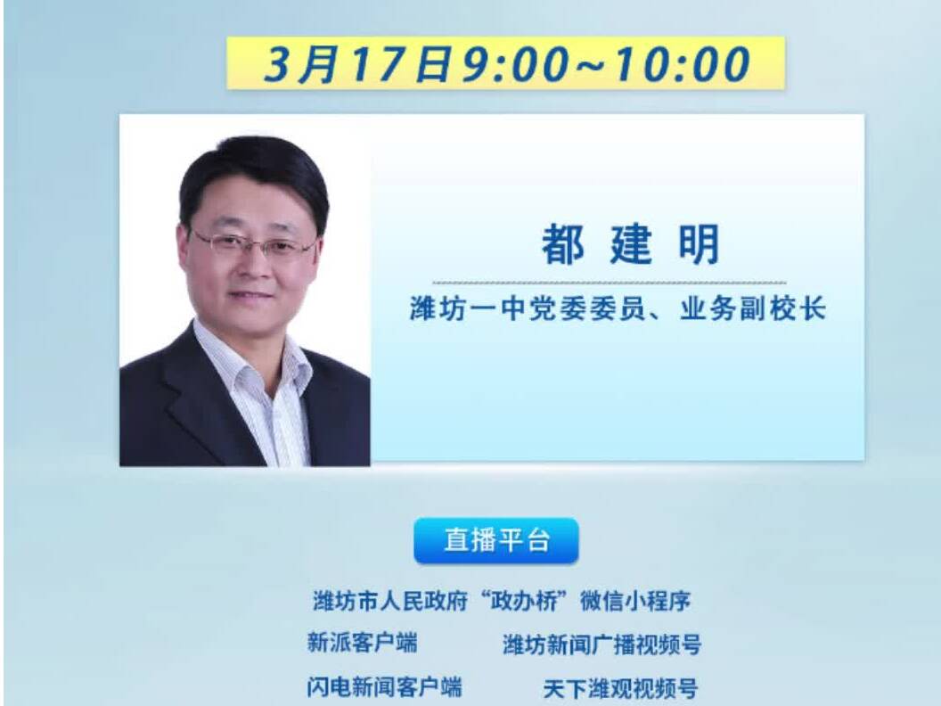 3月17日上午9:00--10:00,濰坊一中黨委委員、業(yè)務(wù)副校長都建明將走進市融媒體中心新聞頻率《政策訪談》欄目直播間,敬請關(guān)注!